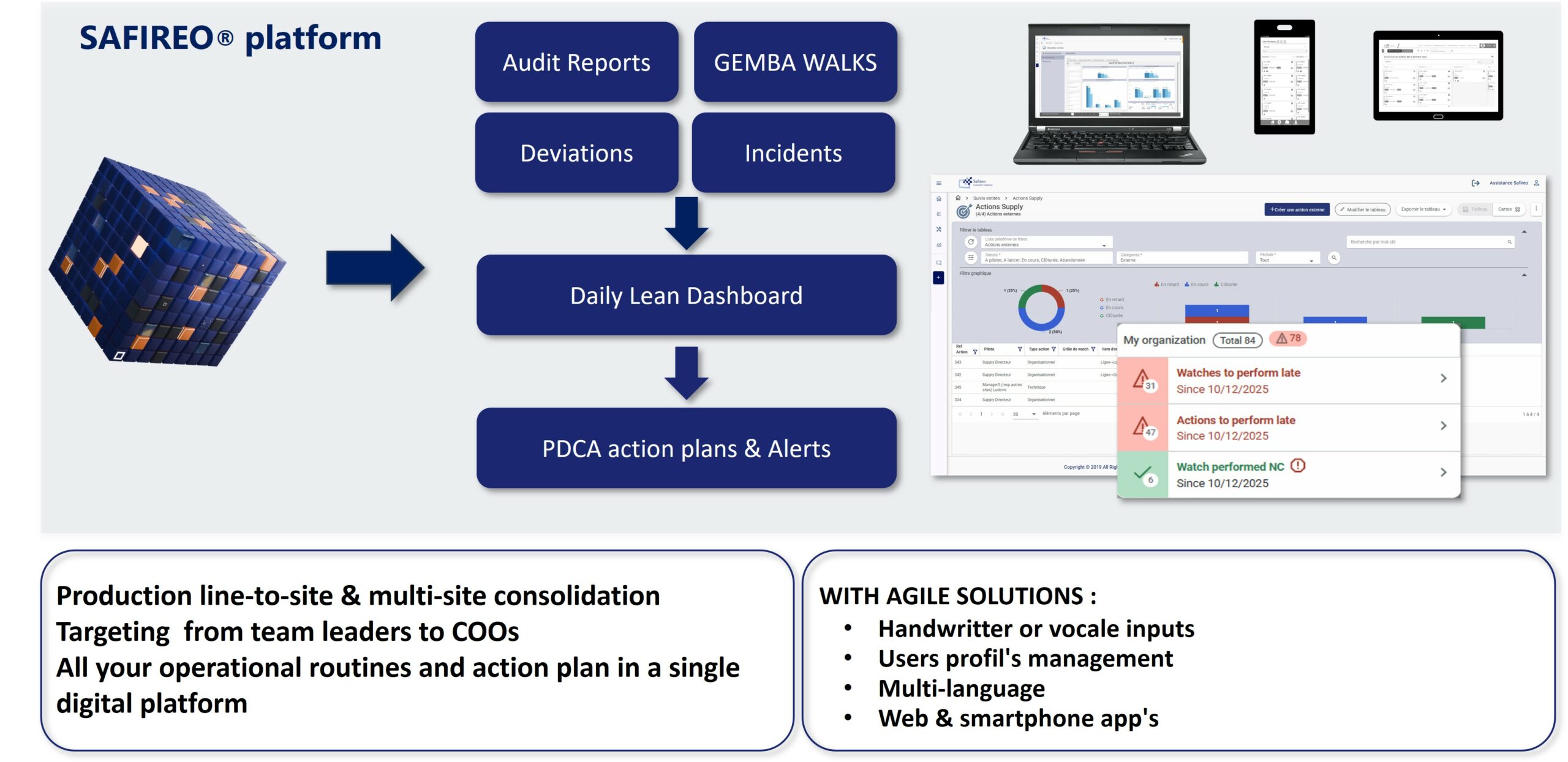 It structures daily routines, standardizes action tracking, and consolidates performance across sites to drive continuous improvement at scale.