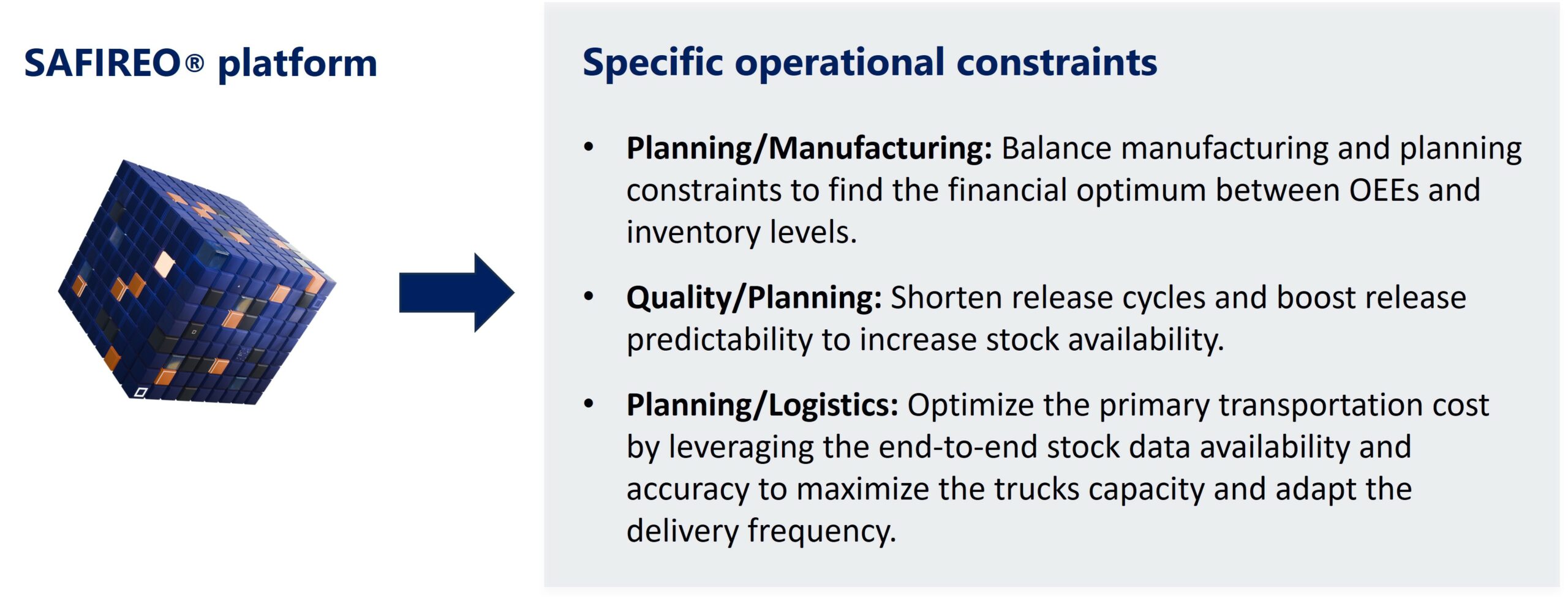 From balancing manufacturing and supply chain constraints by optimizing the OEE-inventory levels, reducing the quality release time to optimizing the transportation costs, each product is designed to secure critical decisions and deliver measurable business impact.